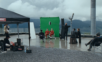 In the light of the Alps, a great ski-jumping hill flashes metallically. Two ski jumpers synchronously rehearse movements in the valley, answer generic questions in front of a green screen and pose on the hill while being watched by a film crew. It is the first reunion for the two athletes since their separation.