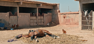 In the desert, a lone rider approaches at full gallop. His old, tired horse is not convincing. Let's do the scene again. Still not convincing. What are we going to do with this horse?